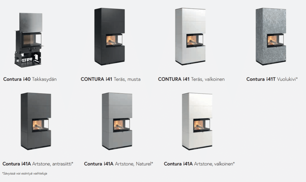 Contura i41 -takat ovat nyt tilattavissa hintaan 5740 € (Ci41 musta teräs), 5840 € (Ci41 valkoinen teräs), 6085 € (Ci41A Artstone Naturel (harmaa)), 6585 € (Ci41A Artstone valkoinen tai antrasiitti) ja 7050 €(Ci41T vuolukivi).